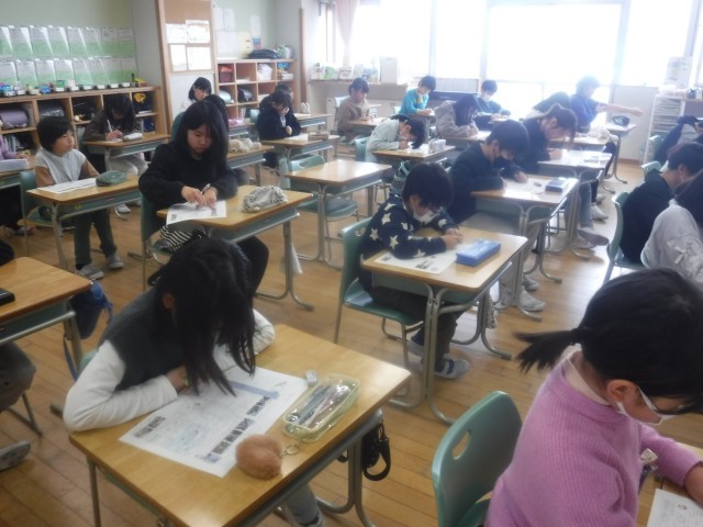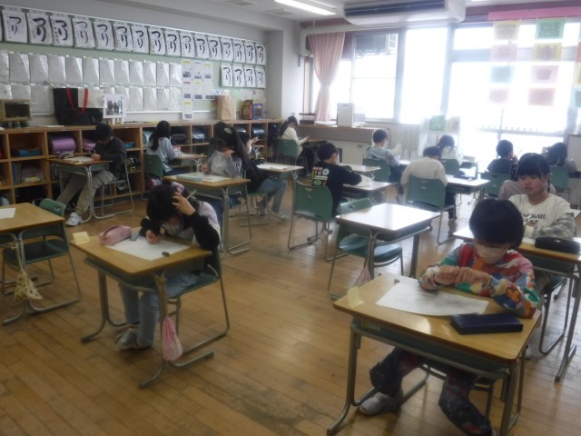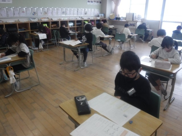 今年度も大詰め。学習のまとめの時期です。1時間目に各教室を回っていると、3学期のたしかめテストをしている学級がいくつもありました。2年生は国語、3年生は算数、4年生は社会のテストに取り組んでいました。終わった後も見直しを丁寧にするなど、みんな真剣に取り組んでいました。