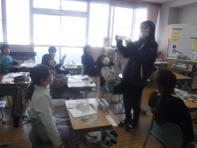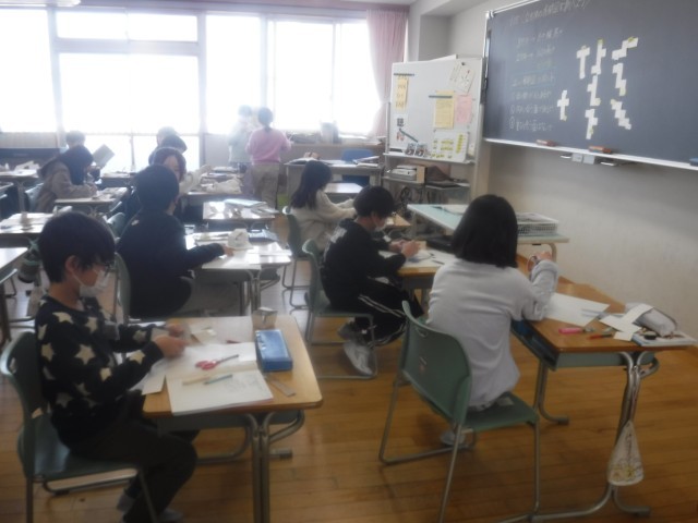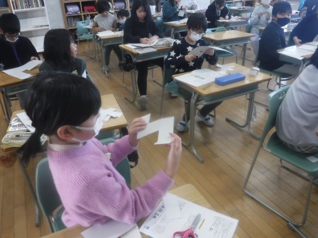 立方体の展開図を作成していました。図形の学習でも、なかなか理解が難しい分野です。作成した展開図から立方体を作ってみるものの上手くできず、「失敗した!」という声が上がります。担任はすかさず、「失敗の原因を考えてみよう」と子供たちに返します。失敗をし、試行錯誤を繰り返しながら、展開図への理解を深めていました。