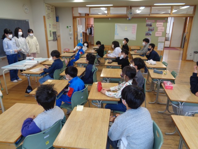 地区別児童会がありました。新年度の地区長が、集合時間、集合場所、並び方を確認しました。
