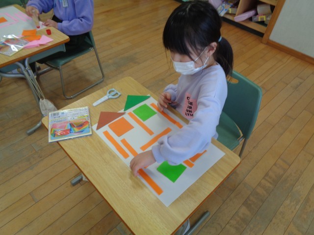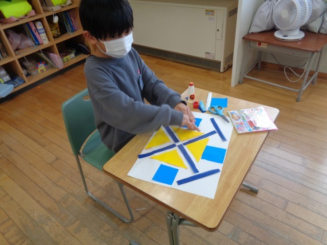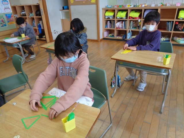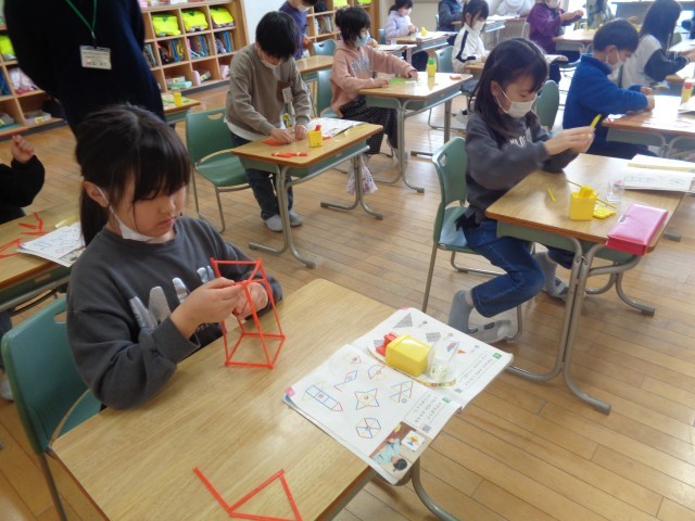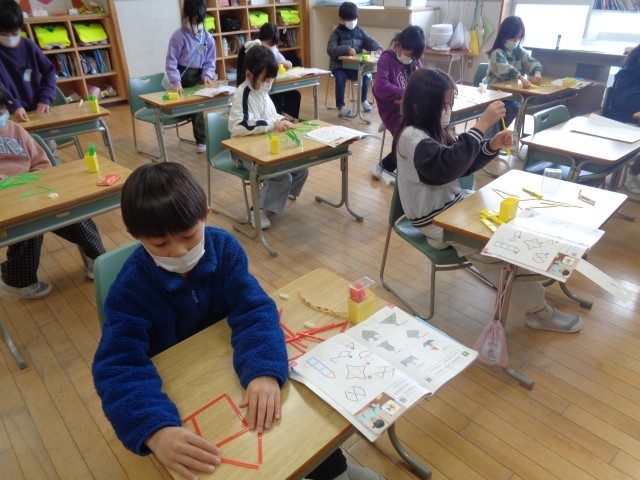 算数科「かたちづくり」の学習では、色板や数え棒、折り紙などを使い、実際に操作しながら形の特徴を見付けました。