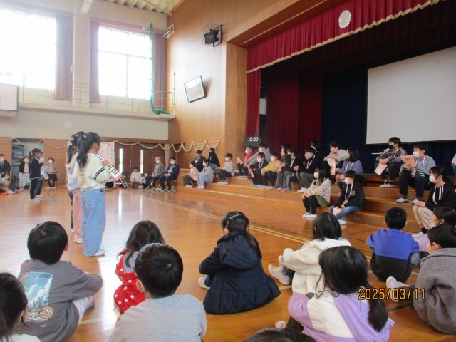 卒業を祝う会で2年生は、音楽科でふけるようになった「こぐまの二月」の演奏と替え歌をつくり、プレゼントしました。