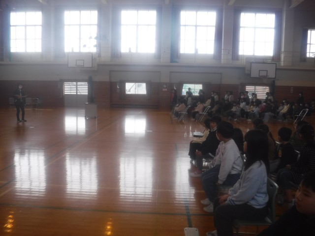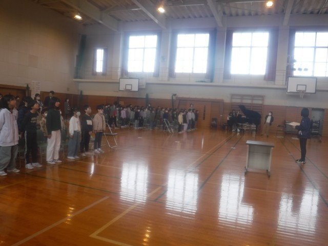 在校生全員が体育館に集まり、卒業式の練習を行いました。気持ちを込めて歌うこと、姿勢でもお祝いの気持ちを表すことを確認しました。練習を通し、6年生を送る気持ちが高まりました。