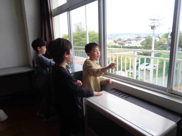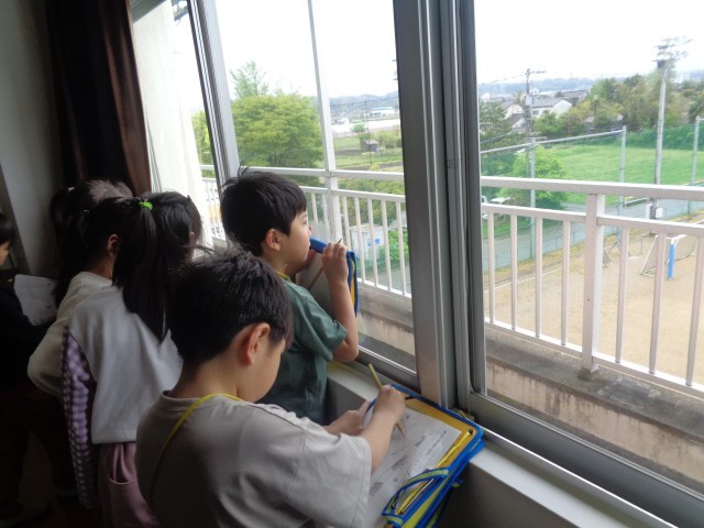 社会科「わたしたちのまち みんなのまち」では、学校の高いところから見た町の様子を調べました。建物だけではなく、田んぼや畑、川などが多くあったことから、老田は自然豊かな町であると振り返っていました。