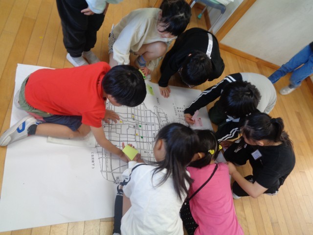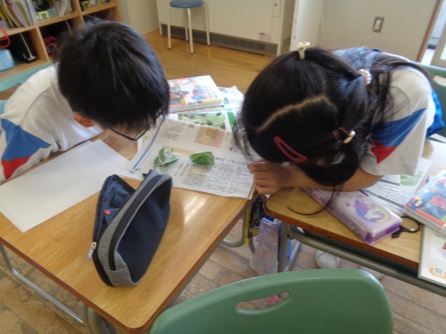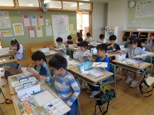 社会科では、老田の町のことを絵地図に表しました。図画工作科では、水の量を調節しながら絵の具を使って描きました。体育科では、運動会に行う中学年競技の練習を行いました。理科では、チョウのたまごや幼虫の観察をしました。どの学習も頑張っています。