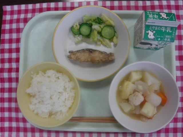 5月8日(木)今日の給食 公開日 2025/05/08 更新日 2025/05/08 本日の給食 今日の献立は、ごはん、牛乳、あじのから揚げ、きざみ和え、和風ポトフです。肉団子やだいこんが入った和風ポトフは、やさしい味わいでじんわりおなかにしみわたります。