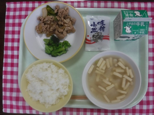 5月9日(金)今日の給食 公開日 2025/05/09 更新日 2025/05/09 本日の給食 今日の献立は、ご飯、牛乳、焼き肉、ゆでブロッコリー、みそ汁、味付け小魚です。ピーマン、タマネギと一緒に焼いた豚肉、甘い味付けで、あっさり塩味のブロッコリーともよく合います。