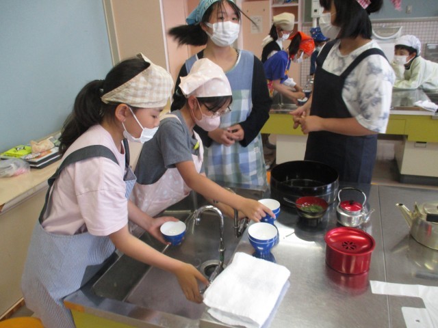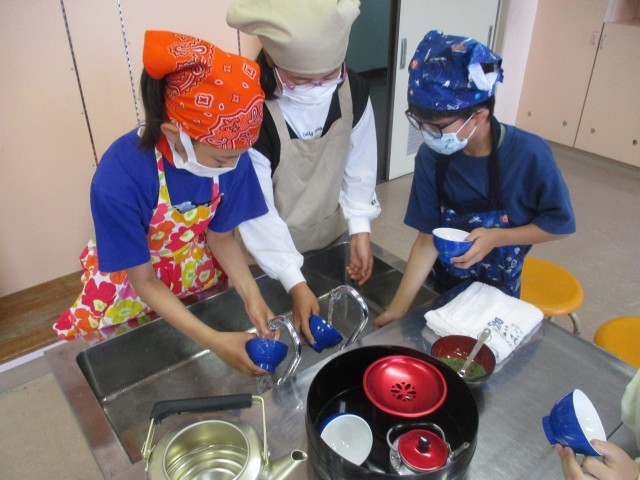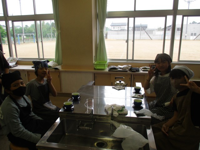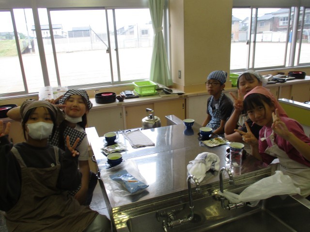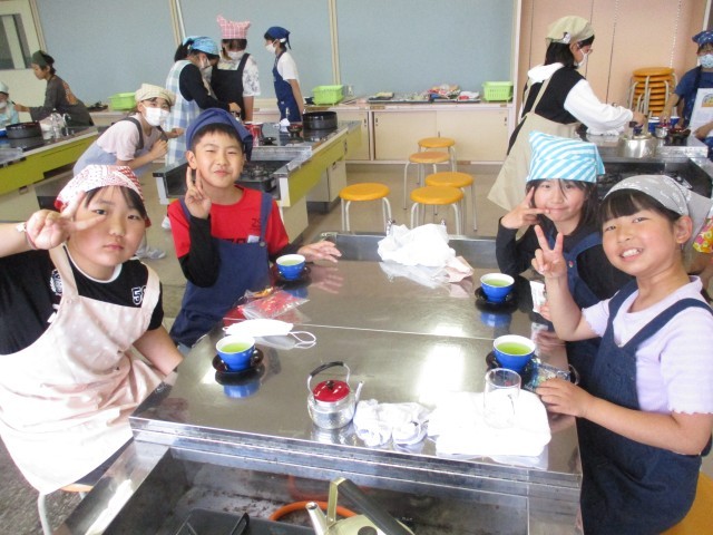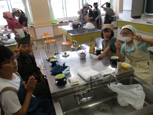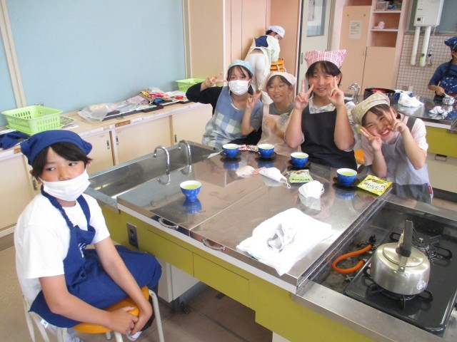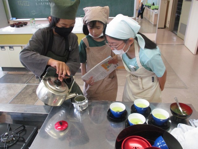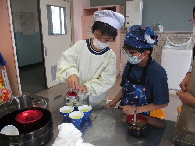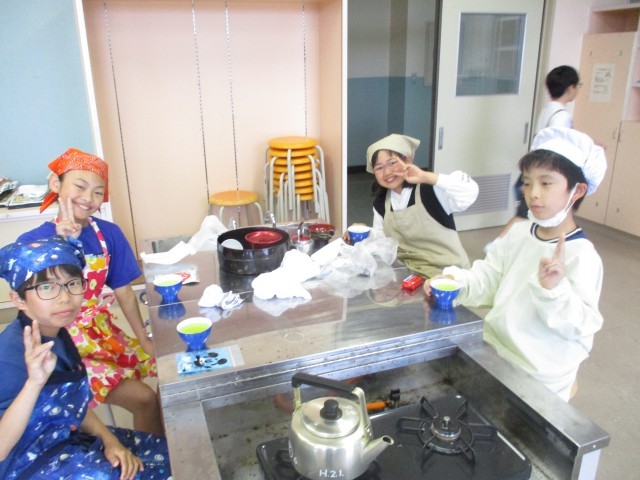 調理実習でお茶をいれました。今回は緑茶とほうじ茶を入れて飲み比べていましたが、好みが分かれたようです。準備から、片付けまでみんなで協力して行い、家から持ってきたお菓子と一緒においしくお茶をいただきました。高学年になり、初めての調理実習はみな楽しそうでした。