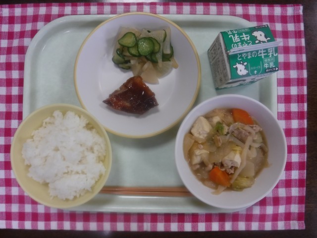 6月3日(火)今日の給食 公開日 2025/06/04 更新日 2025/06/04 本日の給食 今日の献立は、ご飯、牛乳、赤魚の照り焼き、酢の物、肉豆腐です。甘い赤魚ときりっとした味付けの酢の物がよく合いました。