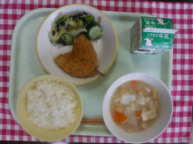 今日の献立は、ご飯、牛乳、あじフライ、海藻サラダ、みそ汁です。