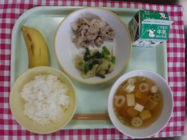 今日の献立は、ご飯、牛乳、豚肉の塩こうじ炒め、おひたし、すまし汁、バナナです。