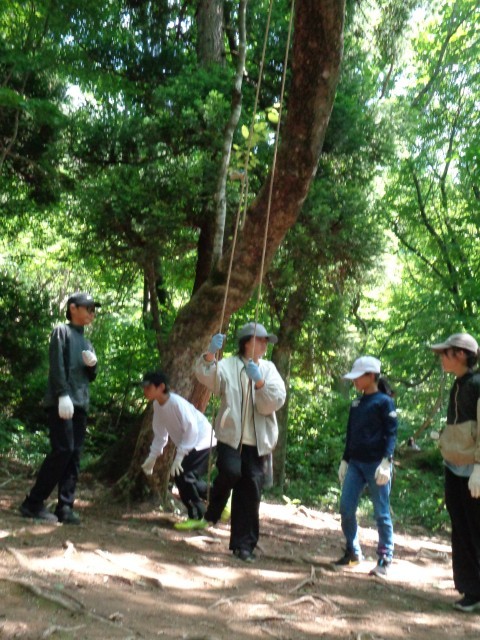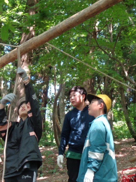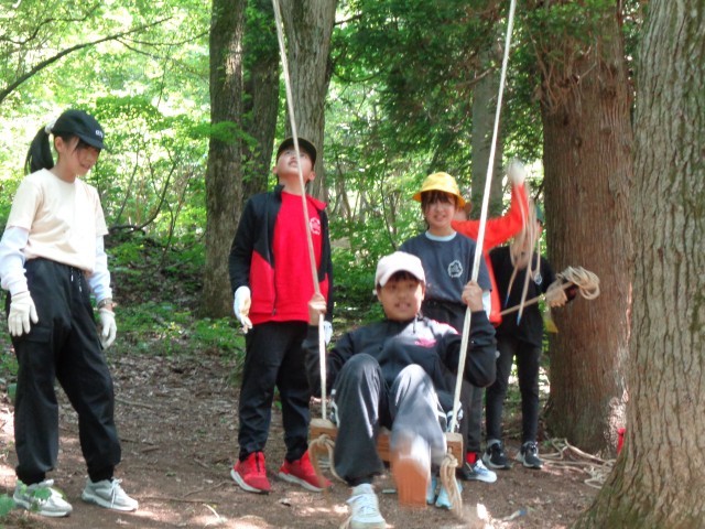 宿泊学習1日目。ロープと木の板を使って、ブランコやターザンロープ、ハンモックをつくりました。