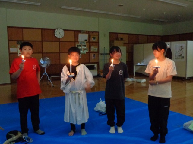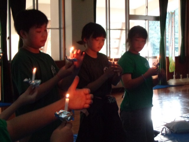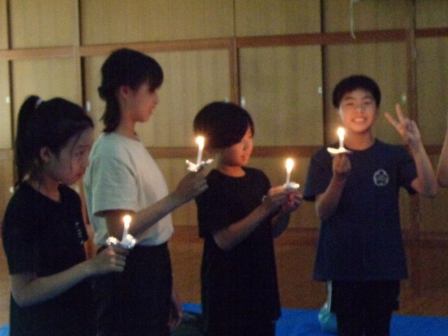 宿泊学習1日目。キャンドルサービスをしました。女神役からろうそくの火をもらい、全員の火が灯る空間でゲームをしたり歌を歌ったり楽しい時間を過ごしました。