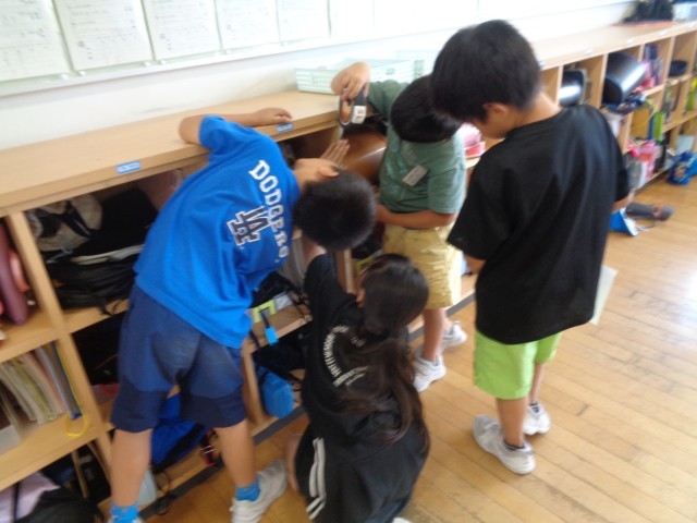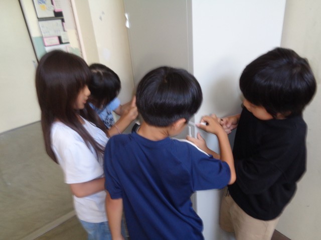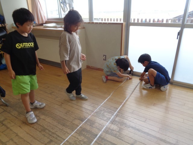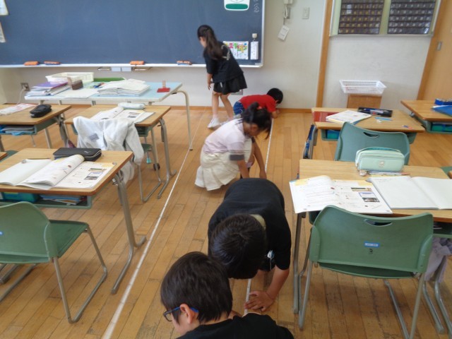 算数「長い長さをはかって表そう」では、巻き尺を使い、いろいろな物の長さを測りました。また、「km」「きょり」「道のり」等の新しい単位や言葉も覚え、長い長さを表していました。