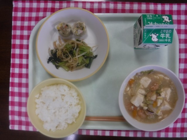 今日の献立は、ご飯、牛乳、野菜シューマイ、ナムル、えびと豆腐のうま煮です。