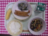 今日の献立は、ご飯、牛乳、ししゃもフライ、よごし、大豆の磯煮、バナナです。にんじ...