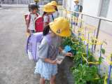 登校した子供たちは、今日もアサガオに駆け寄ります。 「ペットボトル2回分、水を...