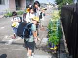 登校した子供たちは、アサガオの鉢に駆け寄ります。 お兄ちゃん、お姉ちゃんも一...