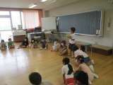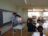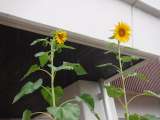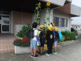 今朝、登校した5年生の子供たちが、背の高いヒマワリとプランターで咲いているサル...