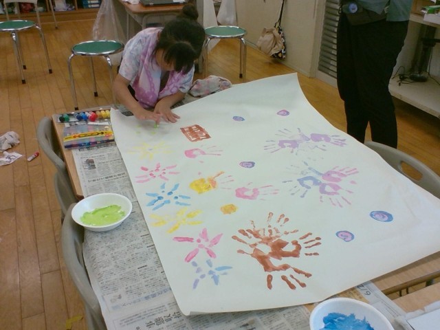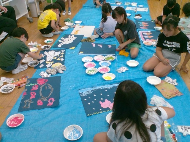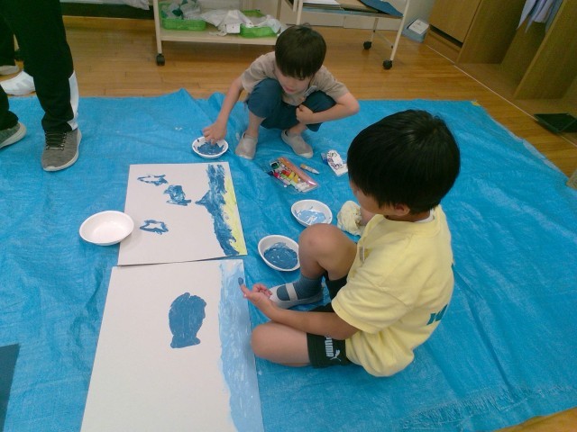 液体粘土のとろとろな感触を楽しみながら、指や手のひら全体を使って、思い思いに描いていました。色を混ぜて自分なりのきれいな色をつくっていました。素敵な作品に仕上がりそうです。