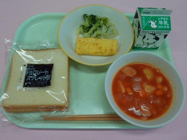 食パンにチョコレートクリームを付けて食べます。いつもよりおいしくいただけそうですね。