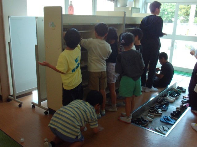 結構、砂がたまっていたようです。みんなの外履きを下に並べて、きれいに拭いていました。