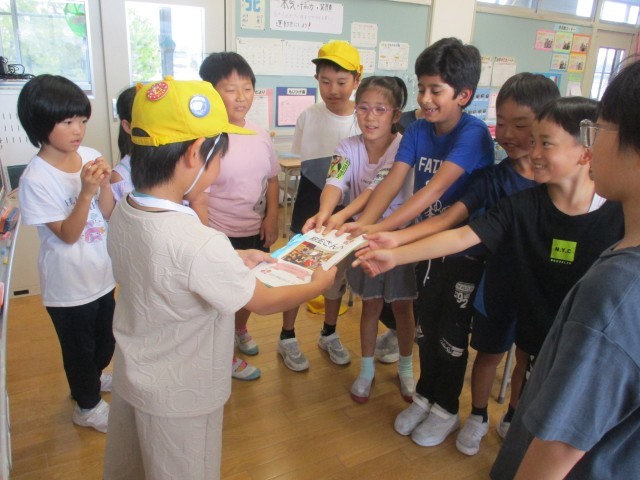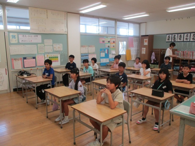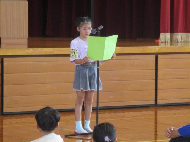 1学期の始業式では、3年生の代表児童が、1学期がんばったことを発表しました。外国語活動や総合的な学習の時間など、新しく始まった教科の学習のがんばりを堂々と発表しました。聞いている人たちの、真剣に聞く態度も立派でした。教室に戻ってからは、夏休み中の安全についてとプールの利用についての話を聞きました。いろいろなことに進んでチャレンジし、安全で楽しい夏休みにしましょう!