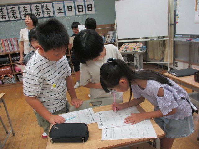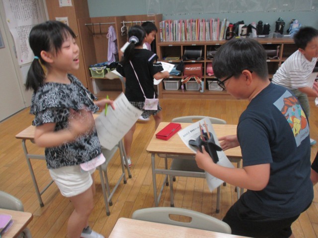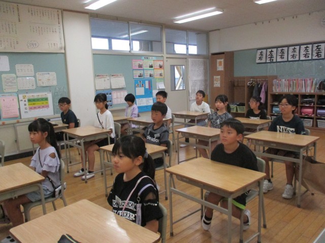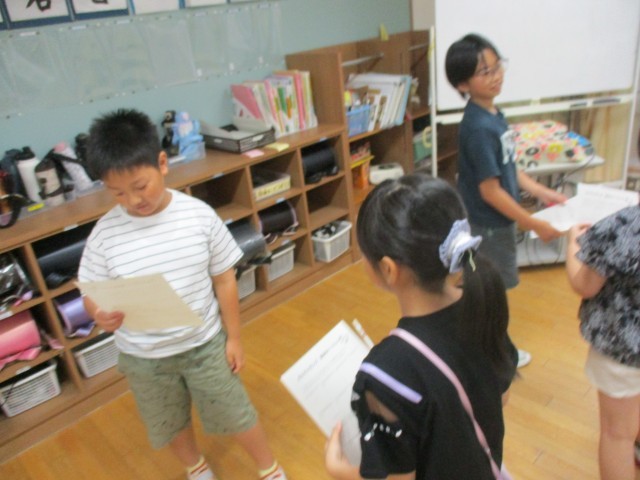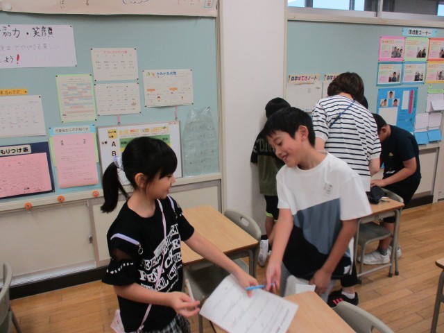 長い夏休みが終わり、いよいよ2学期のスタートです。始業式で、真剣に話を聞いたり校歌を歌ったりする姿から、子供たちのやる気を感じました。学級活動では、夏休みの思い出を聞き出すビンゴゲームを行いました。たくさんの友達や先生と交流しながら、楽しみました。