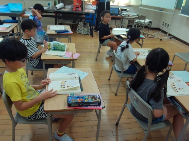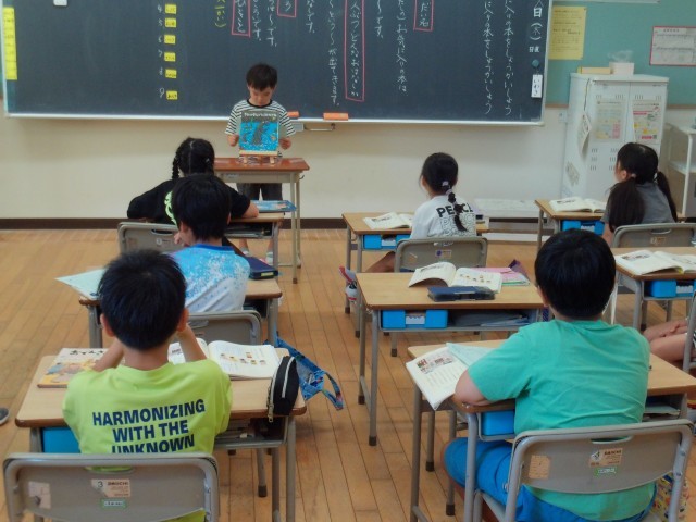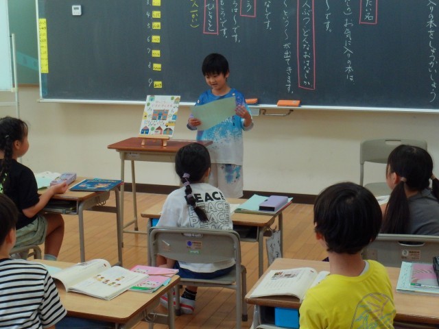 2年生は、夏休み中に読んだ本の紹介をしていました。はじめに、話し方を教わった後、それに合わせて自分のお気に入りの本の作者や登場人物、みんなにお薦めしたいところなどを丁寧に発表していました。聴く態度もとてもよい2年生でした。