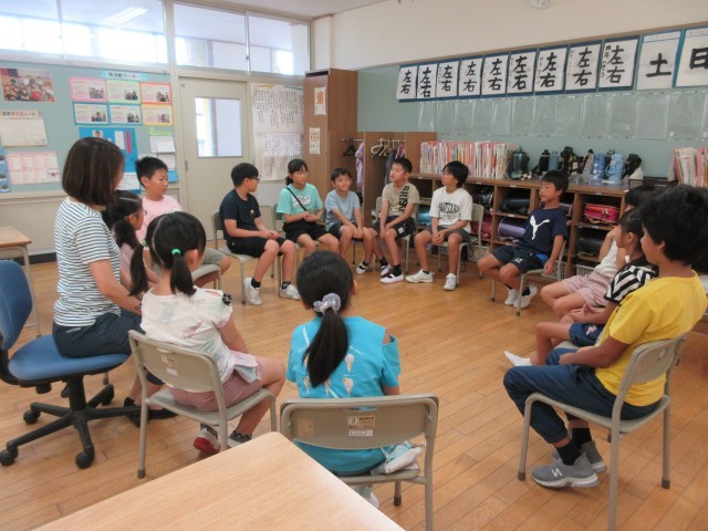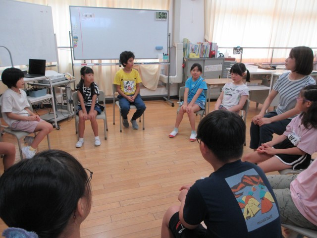 夏休みの思い出についてサークル対話をしました。友達の話を真剣に聞き質問をしたり、繋げて話をしたりしていました。
