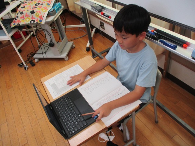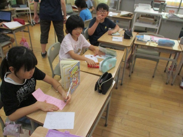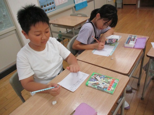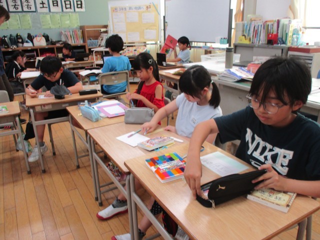 4年生は本のポップ作り、3年生は読んだ本に関するクイズ作りをしています。ポップ作りでは、その本に関心をもってもらうために、いろいろな工夫をしながら作っています。学習参観の際に展示しますので、是非ご覧ください。クイズ作りでは、クイズ大会に向けて友達に内容が見えないように、自分たちで机の配置を工夫しながら活動していました。明日クイズ大会を予定しています。