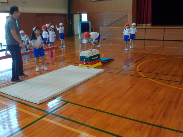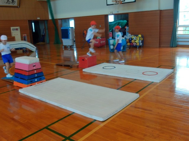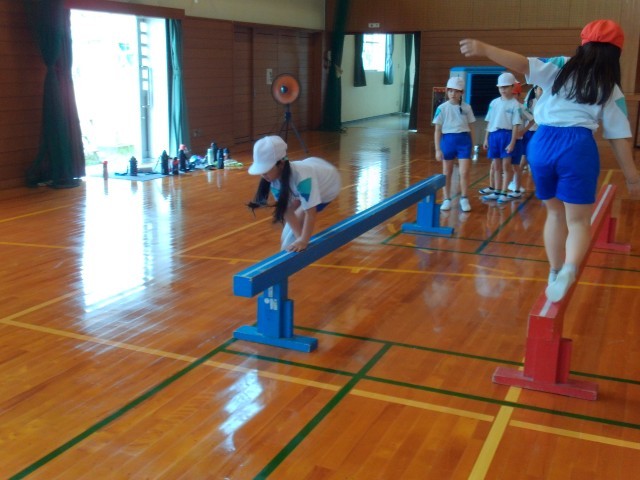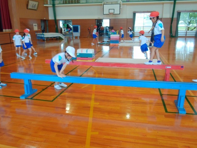 はじめはまたぎ越したり、跳び乗ったりすることを怖がっている様子も見られましたが、少しずつ慣れ、楽しそうに取り組む姿が見られました。