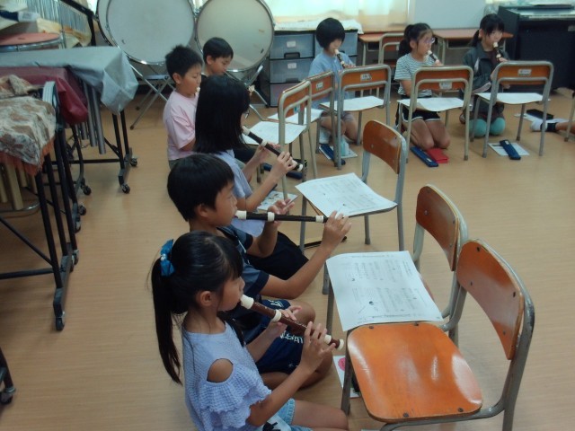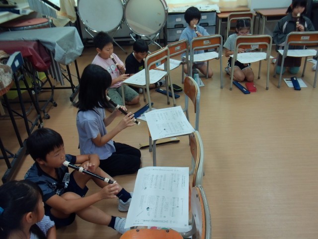 まだリコーダーの演奏に慣れない3年生を、やさしく見守る4年生の姿が見られます。