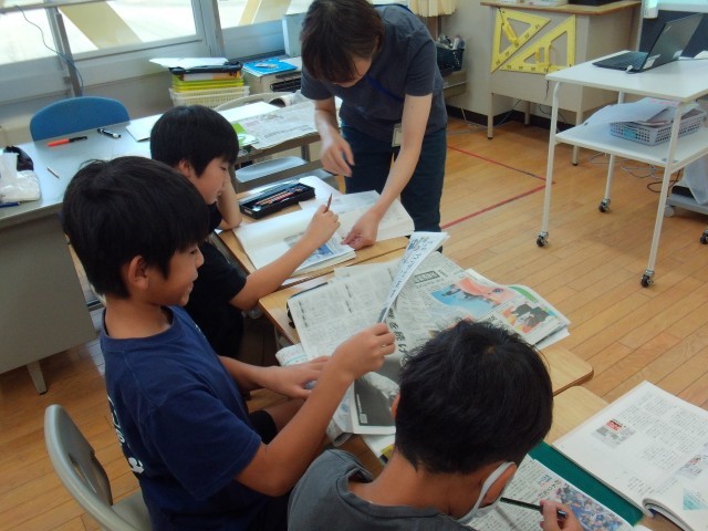 5年生は、新聞を読み、自分の気になった記事を切り抜き、「見出し」「リード文」「本文」がどの部分かを調べ、読者に分かりやすく伝える工夫について考えていました。