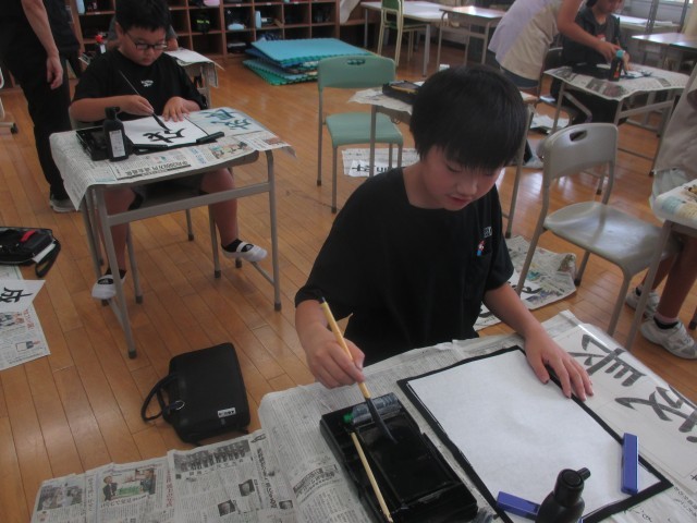 筆の持ち方や、文字のバランス、はねやはらいに気をつけながら、心をこめて丁寧に書きました。「成」の書き順や画数の多さ、「長」のはらいの部分がむずかしく、何度も練習をしていました。