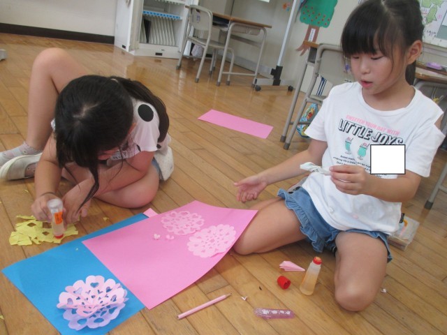 図工では、はさみを使って、切り紙を作って楽しんでいます。今日はできあがった飾りを並べ、色画用紙に貼りました。重ねたときの模様にこだわったり、色の重なりを工夫したりしていました。完成が楽しみです。