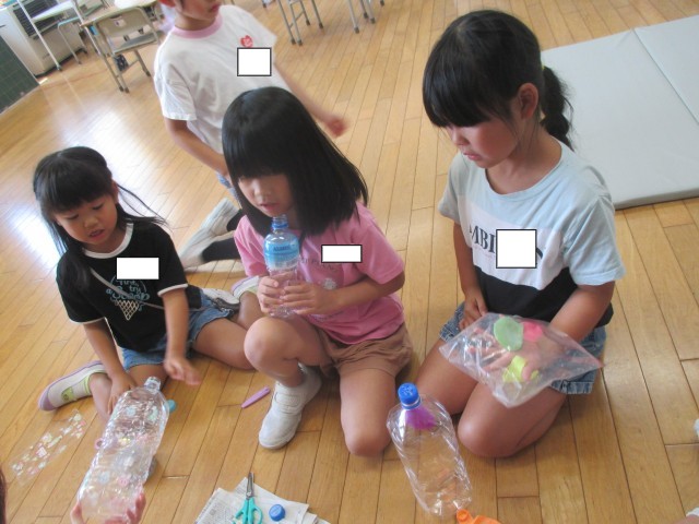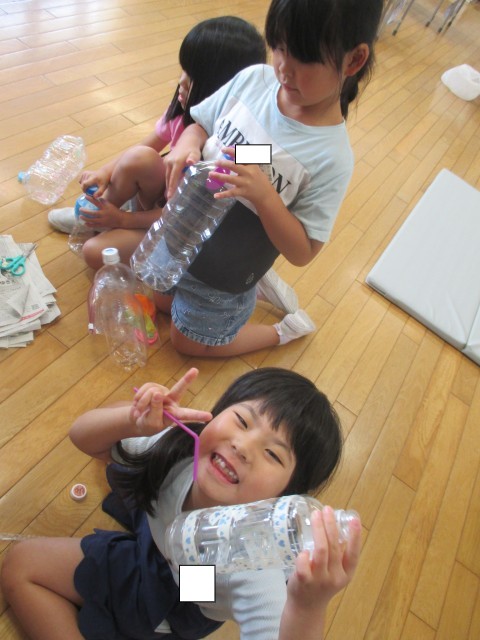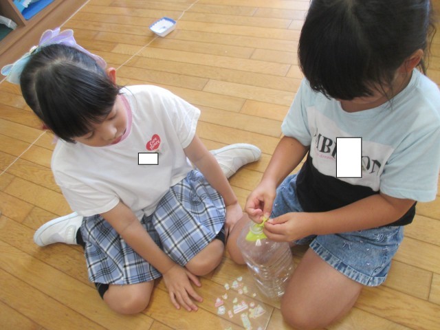 1年生は、水遊びで使用するおもちゃを作っています。安全に気を付けてペットボトルに穴をあけたり、飾りを付けて可愛らしくしたりして、意欲的に活動することができました。今度の水遊びで使うのが楽しみですね。