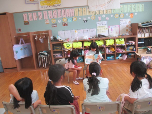 木曜の給食後は、読書タイムです。いつもは担任や司書の先生が読み聞かせをすることが多いのですが、今日は「やってみたい」と2人の子が楽しい絵本やなぞなぞの本を選び、読んでくれました。聞いていた子たちも、真剣に聞いていて、読み聞かせが終わると「面白かった!」とうれしそうでした。