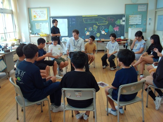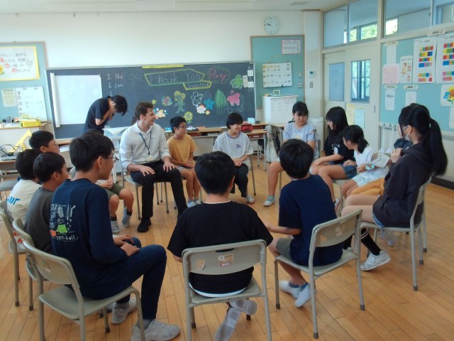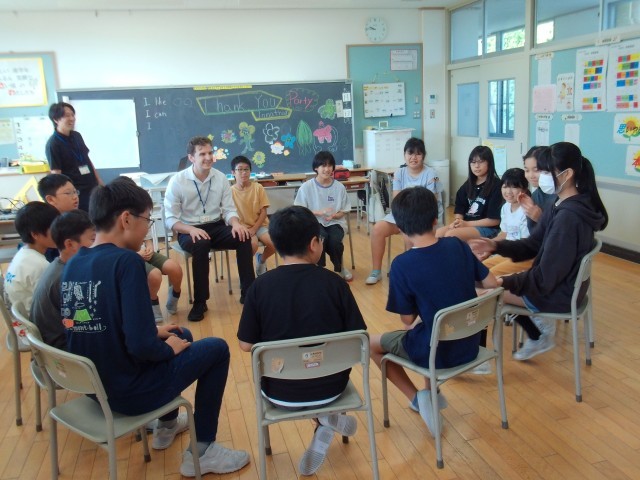 ご都合で今日が最後の授業になるALTと、感謝の気持ちを込めて集会を開いていました。