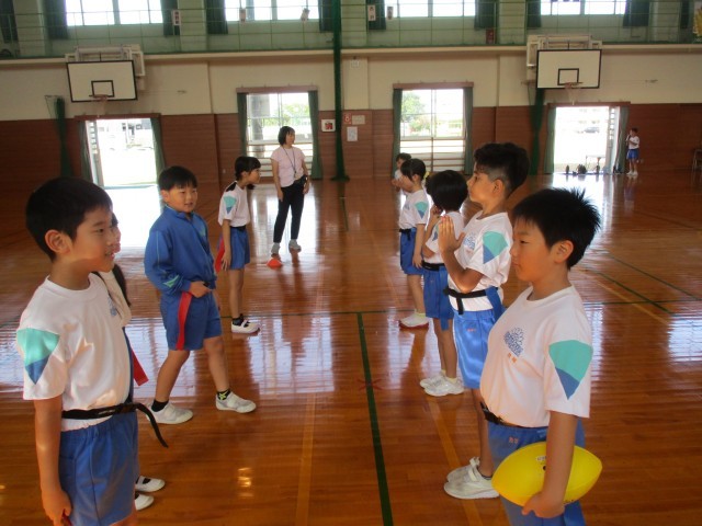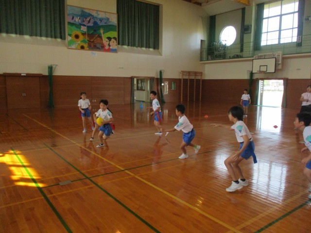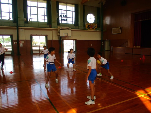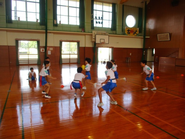 タグラグビーのルールを覚えるために、ためしのゲームをしています。少しずつ慣れてきて、トライの数も増えてきました。ゲーム中は熱くなる子供たちですが、振り返りの時間には、敵・味方に捉われず、互いのよさを伝え合っている姿が見られとてもすてきです。