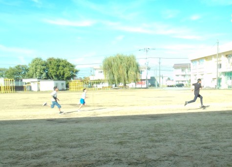 今朝のチャレンジタイムは、久しぶりにグラウンドに出て、50m走です。古沢っ子は、全力を出して走っています。