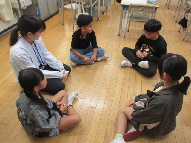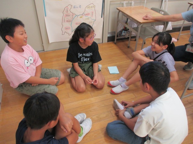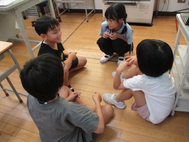今日は、クイズ・ゲーム係からの発表がありました。一つ目はクイズです。クイズがスライドに分かりやすくまとめられていました。二つ目は、くじをつかったゲームです。一枚だけお題の違うくじがあり、それを引いた人を当てるゲームを楽しみました。