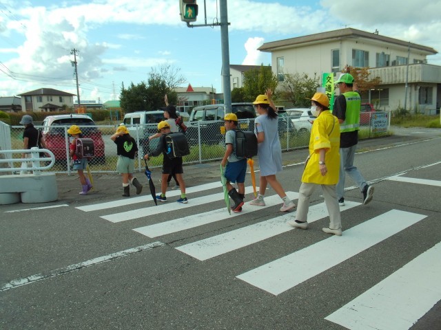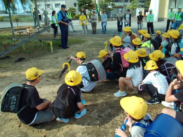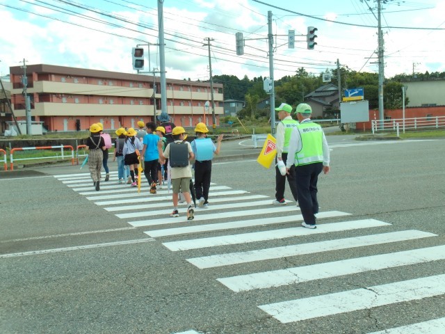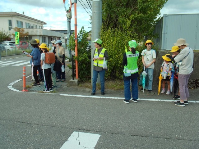 交通事故に遭いそうな場所の地図「ヒヤリマップ」を作成するために、集団下校時に、交通安全母の会や安全見守り隊の皆さんと一緒に通学路の危険箇所を調査しました。