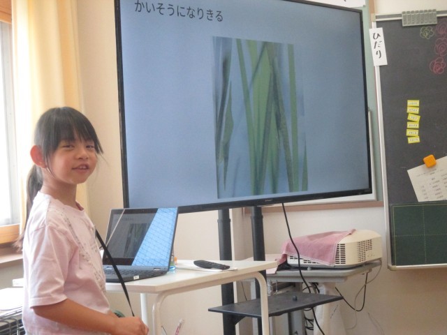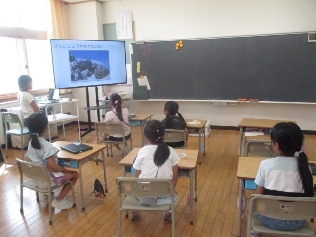 「うみのかくれんぼ」の学習から、他の生き物について調べ、スライドにまとめました。今日はその発表会をしました。子供たちは、上手に発表していました。また、スライドをスムーズに作れるようになったことも笑顔で話していました。