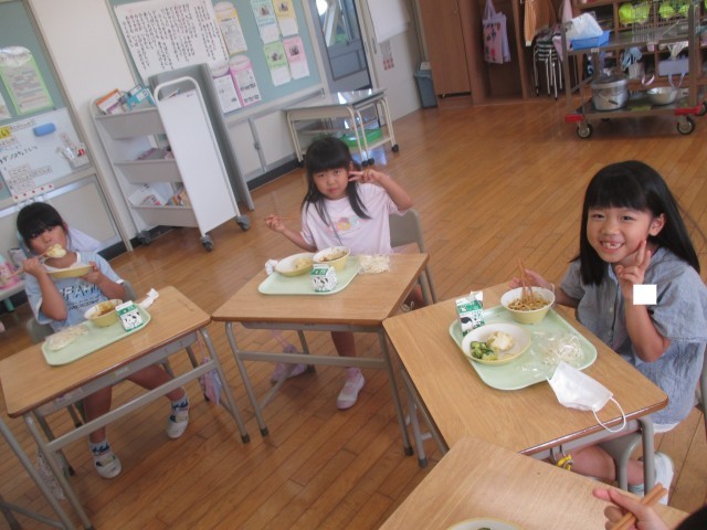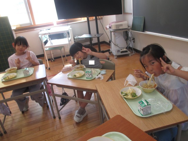 今日の給食は、今年度初めてのソフト麺のメニューでした。初めて食べた1年生。「おいしい!」「毎日これでもいいな」と話しながら上手に食べていました。