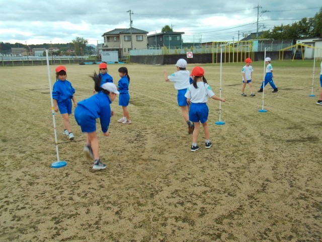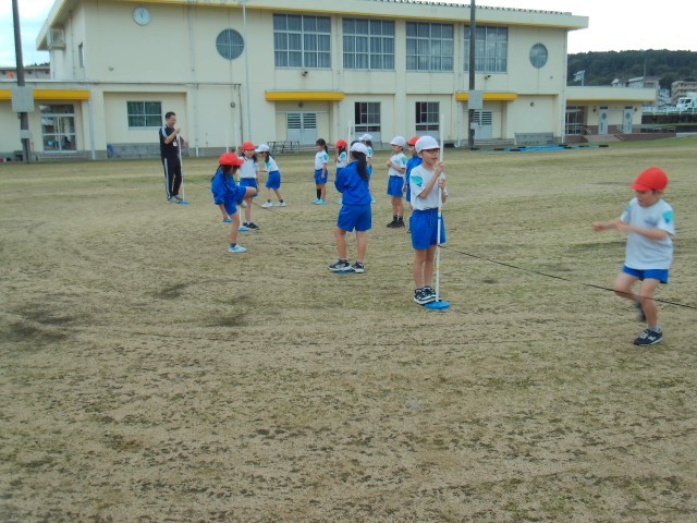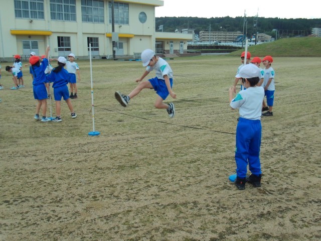 1・2年生は、ゴムを高く飛び越えることに挑戦しています。