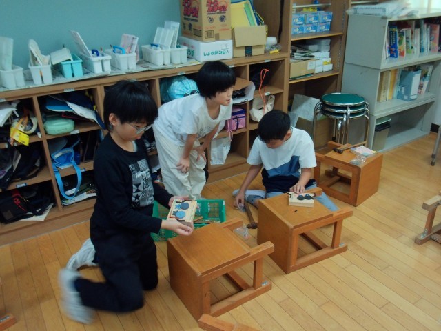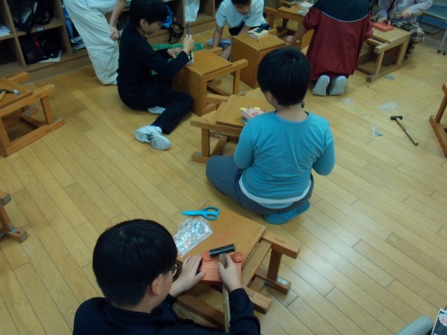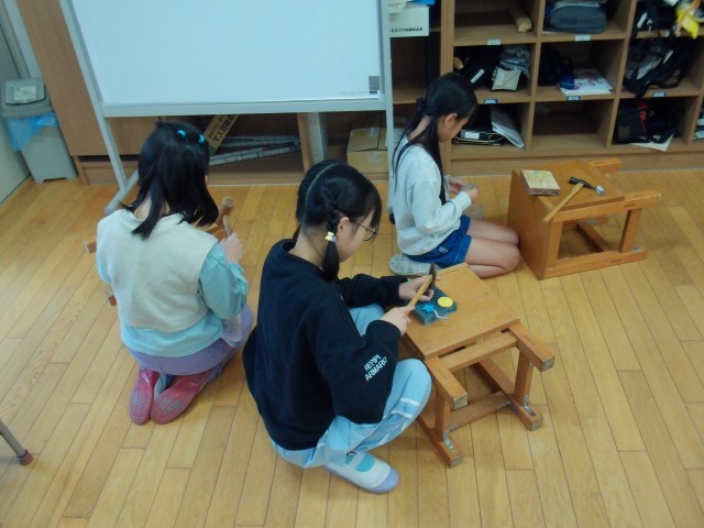 3・4年生が、金槌で釘を打っている音でした。まっすぐに打てなかったときは釘抜きで抜き取ったり、曲がりそうになったときは金槌で修正したりしながらも集中して取り組んでいました。何本も打っていくうちに、まっすぐに打てるようになっていると思います。出来上がりが楽しみですね。