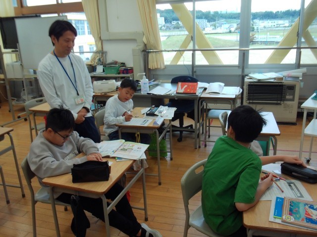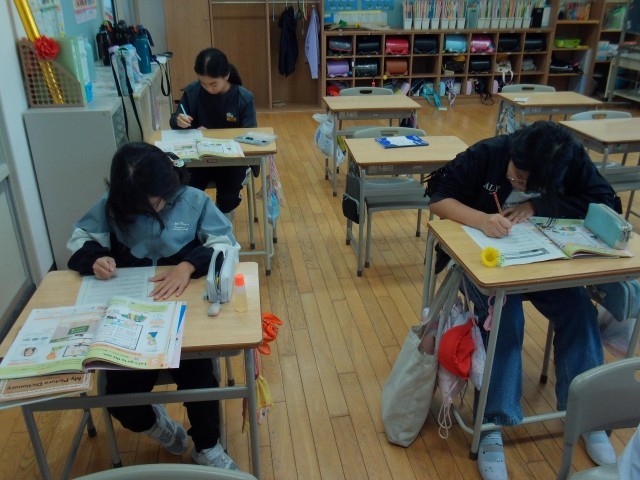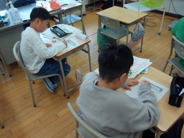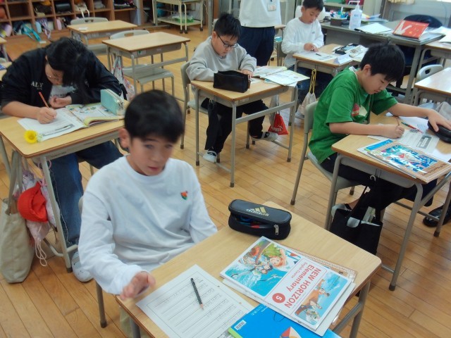 「Go straight.」や「Turn left.」などの言い方について、英語で書くことから始めていました。アルファベットを丁寧に書くことができました。