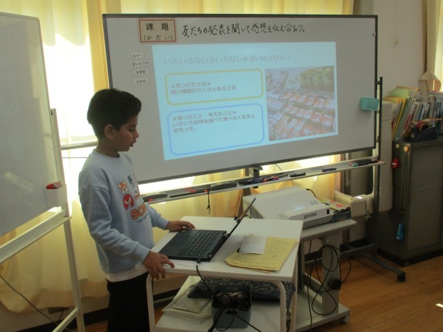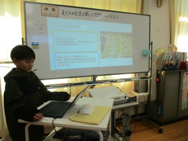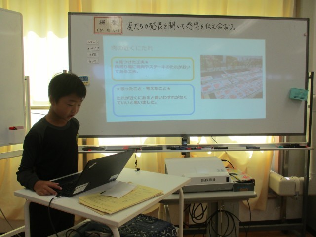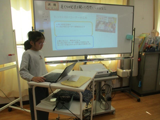 スーパーマーケットの仕事について学習をしてきたまとめとして、見学で見つけた「お店の人の工夫」をスライドにまとめました。旬の食材のこと、魚の切り方のことなど、自分の見つけた工夫をまとめ、わかりやすく伝えることができました。