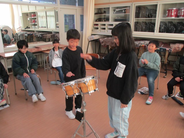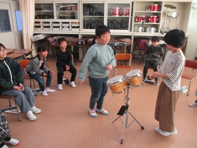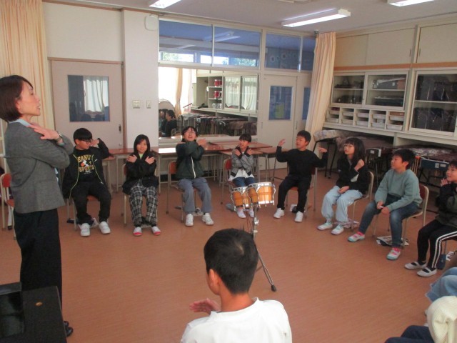 最初にみんなでリズム遊びをしていました。友達の動きや歌声をよく聞きながら楽しんでいます。