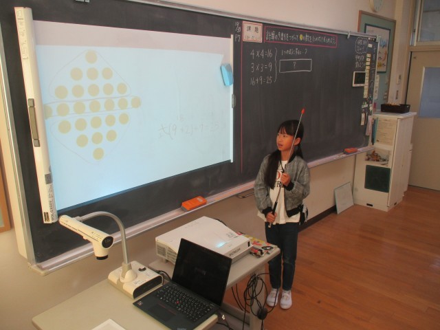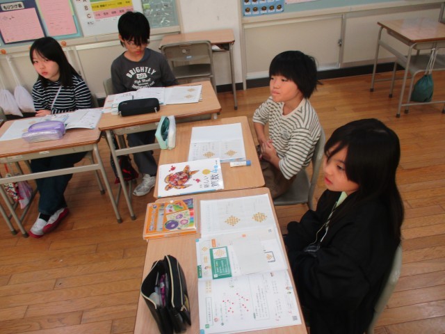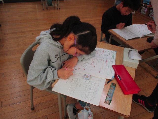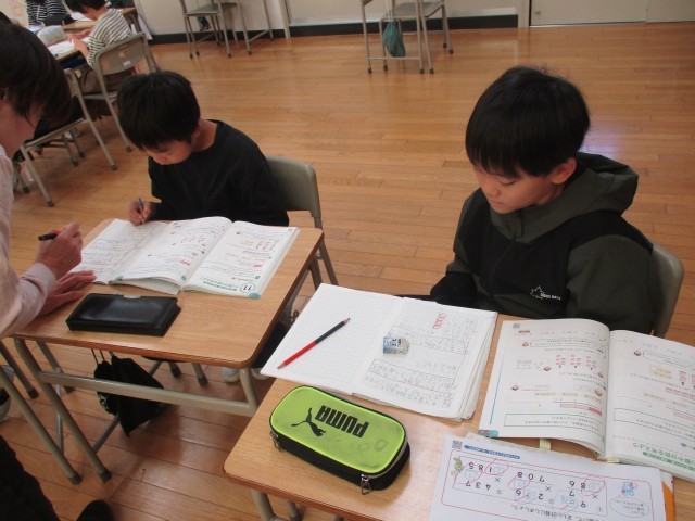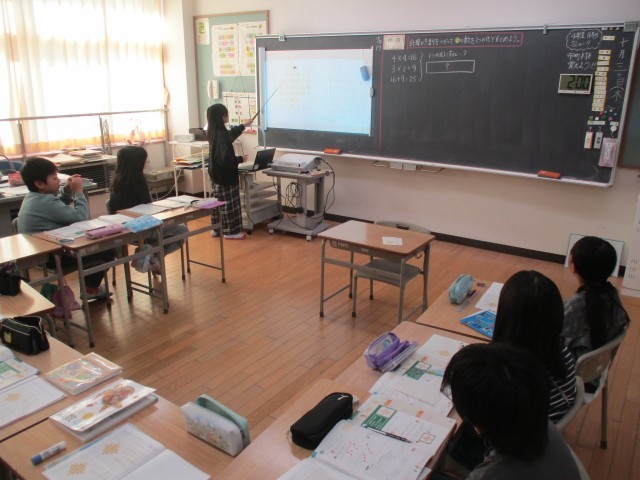 4年生「計算のきまり」、3年生は「大きい数のわり算」の学習をしています。図を使って自分の考えを説明したり、計算問題に集中して取り組んだりしました。